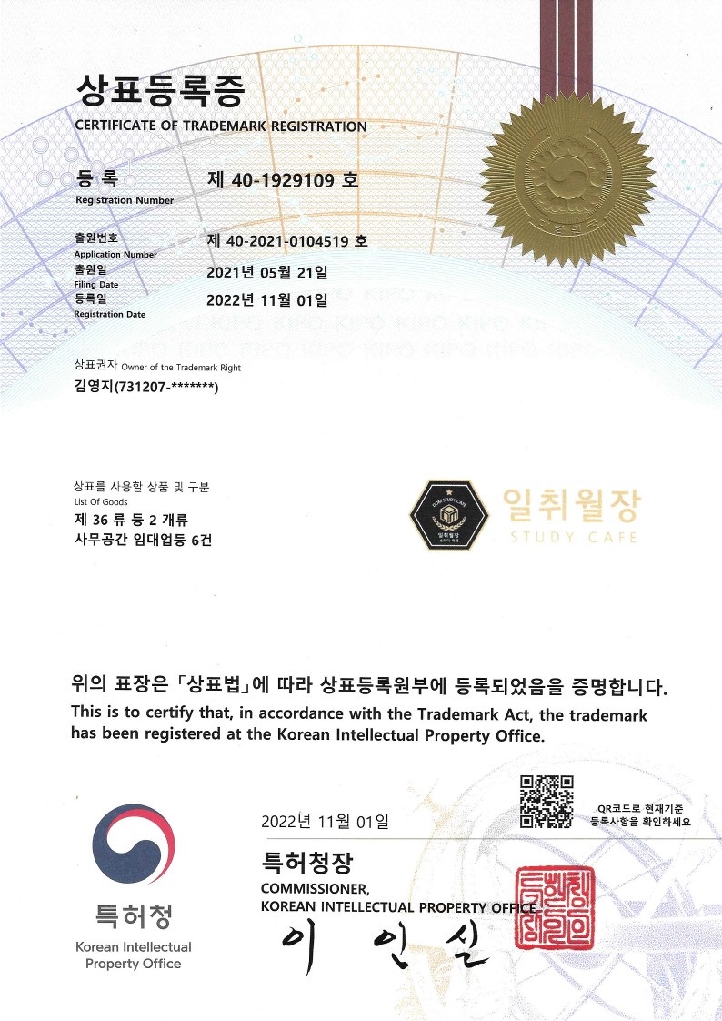 11월 1일 일취월장스터디카페의 상표등록이 완료되었습니다.