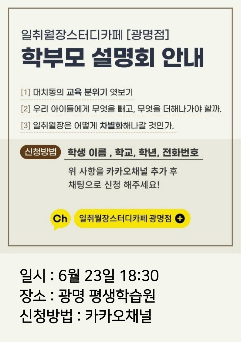 2023년 일취월장 광명점 오픈 학부모 설명회 신청 안내